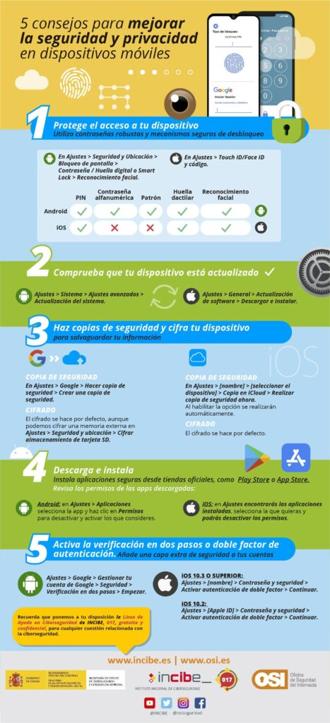 Habilita el bloqueo de pantalla con PIN, patrón, contraseña o biometría (huella/facial) en todos los dispositivos móviles y ordenadores. Activa el cifrado completo del disco en portátiles y smartphones. Realiza copias de seguridad automáticas y periódicas en un disco duro externo o en la nube. Esto protege tu información en caso de robo, pérdida o fallo hardware, permitiendo una recuperación rápida.